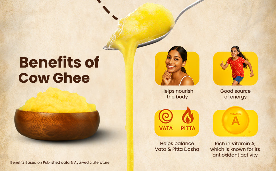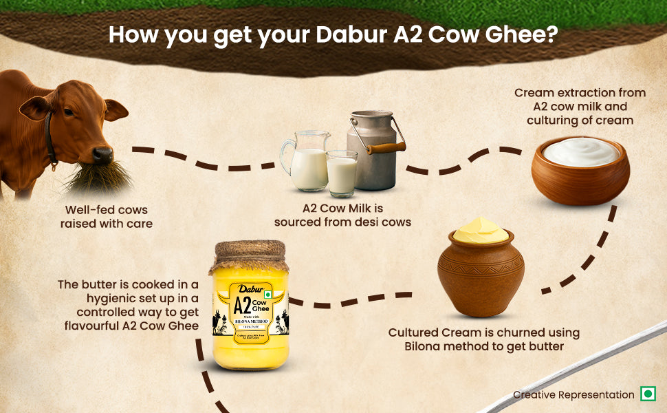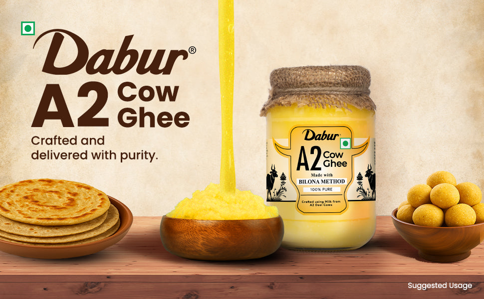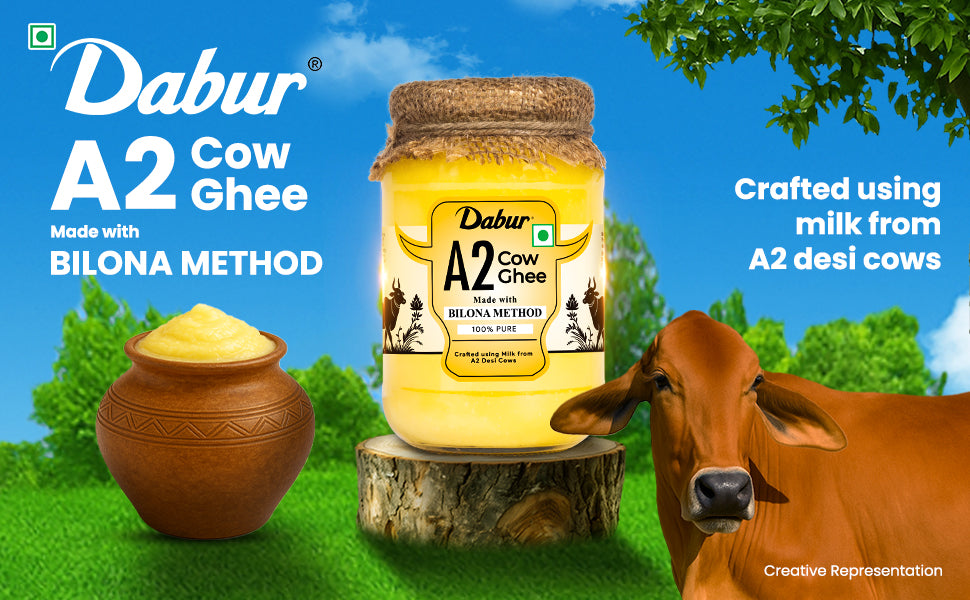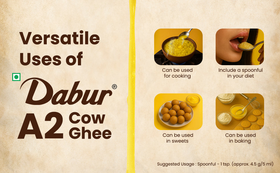 Dabur A2 Cow Ghee is traditionally known to be a rich source of energy and contains the goodness of Vitamin A, known for its antioxidant benefits. It is naturally rich in short chain fatty acids and supports overall nourishment. As per ancient Ayurvedic literature, Dabur A2 Cow Ghee also helps balance Vata and Pitta Dosha.