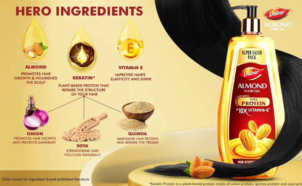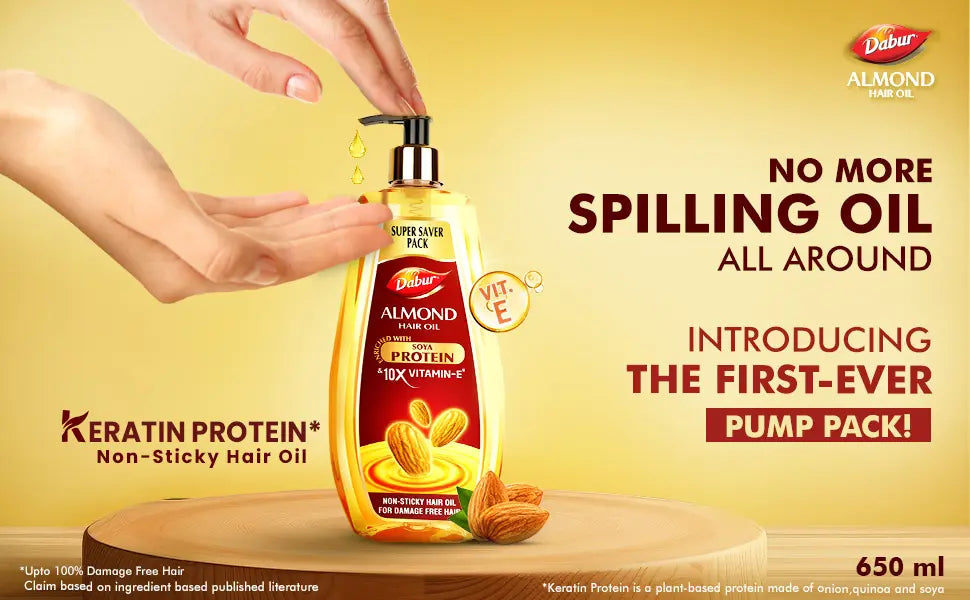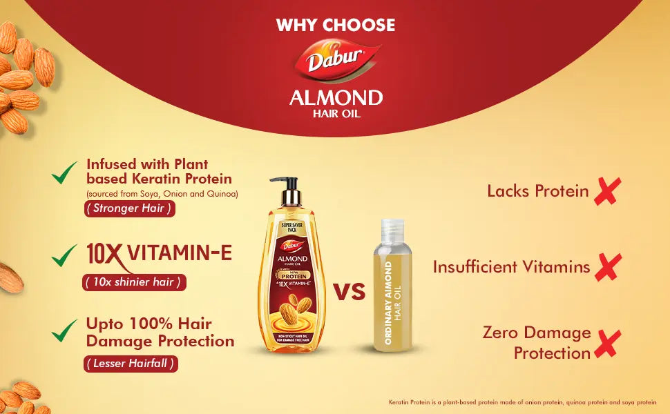 Do you suffer from hairfall or dry and dull hair? Well to solve this, you need to address the problem at source. Hair is made up of protein. Environmental problems like pollution, stress or even hair styling leads to loss of this protein in hair which in turn leads to hair damage. The hair damage eventually results in dry and dull hair or hairfall problems. Now say bye-bye to hair damage with Dabur Almond Hair Oil! Specially formulated with the goodness of Almond, Vitamin-E and enriched with Soya protein, Dabur Almond Hair Oil gives damage free hair and helps make your hair strong from root to tip. So why wait? Switch to Dabur Almond Hair Oil today!