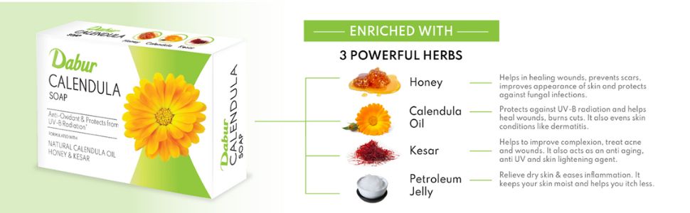 PREVENTS SCARS/SKIN BLEMISHES: Dabur Calendula Soap contains "Honey," which helps prevent scars and skin blemishes, improves skin appearance, and protects against fungal infections.