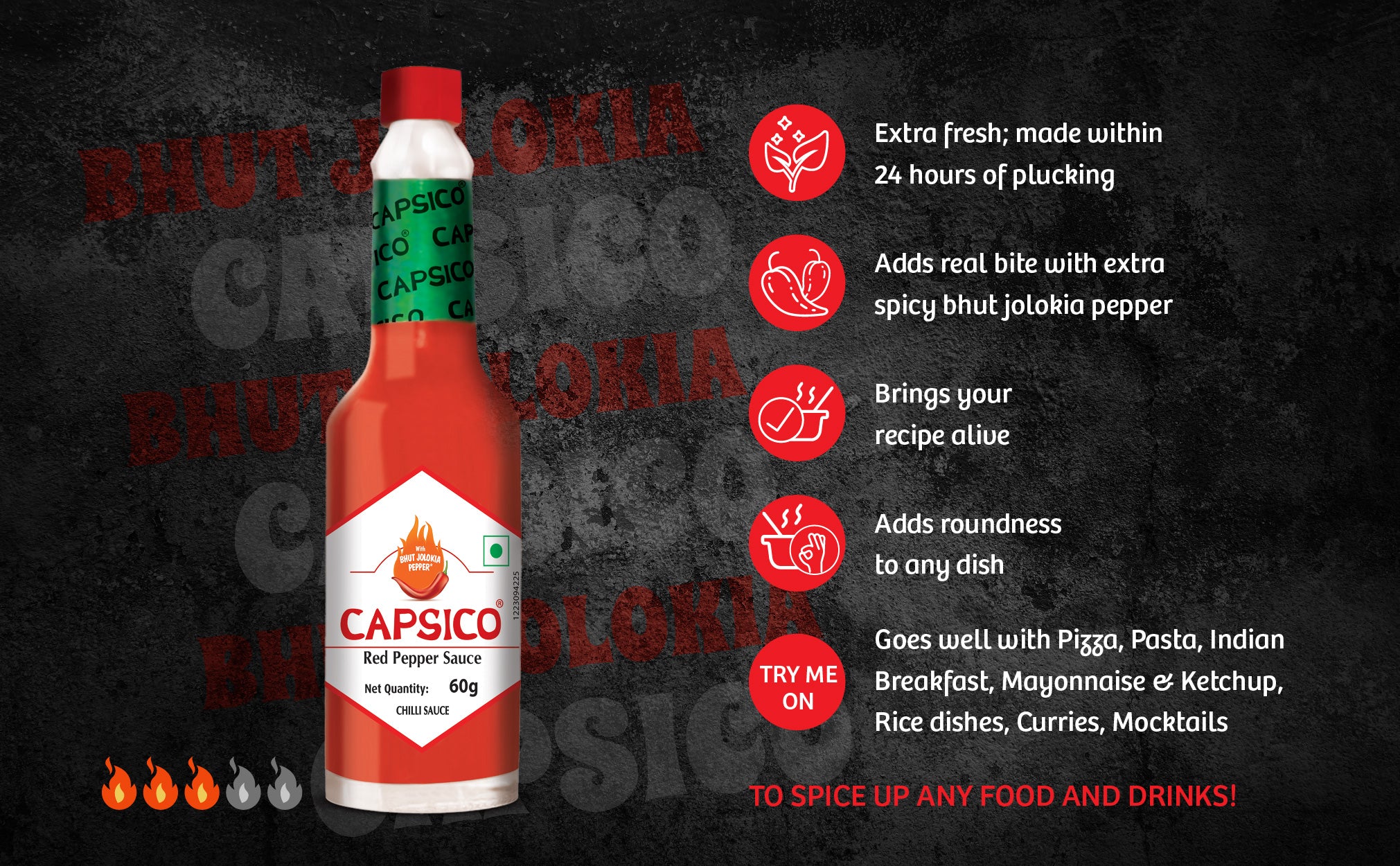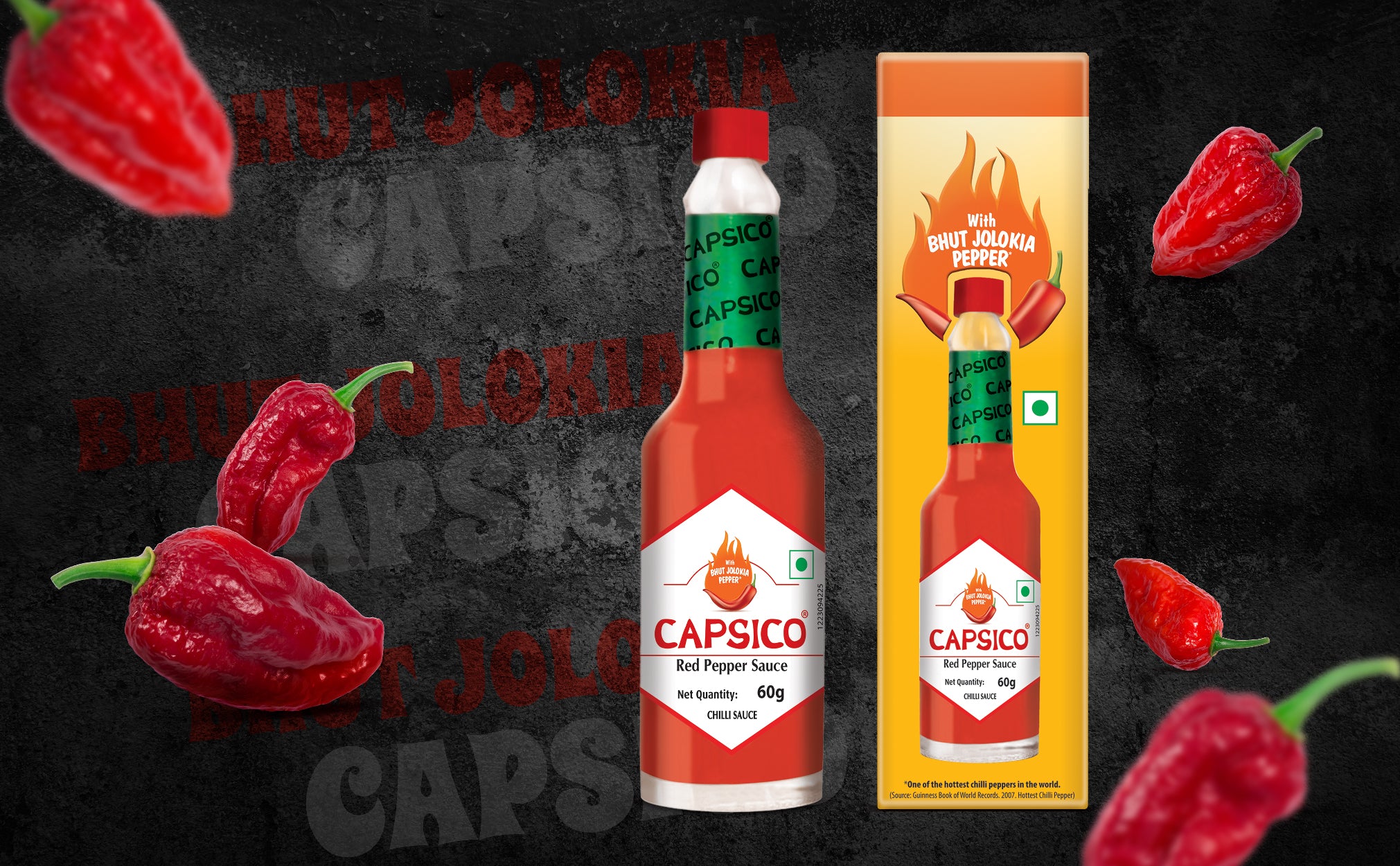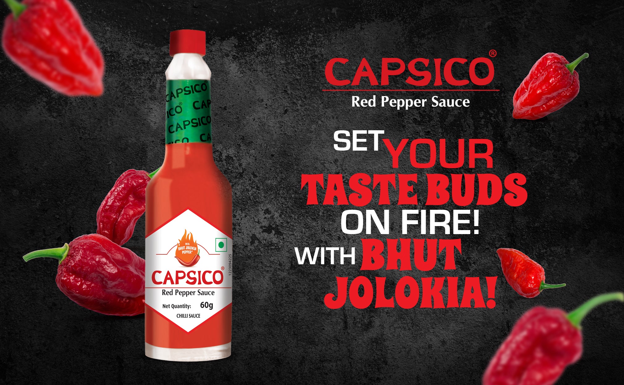 Introducing Dabur Capsico, the epitome of fiery perfection for spice enthusiasts and flavor connoisseurs alike. Crafted with fresh Bhut Jolokia (Ghost Peppers) within 24 hours of plucking, this chili sauce guarantees an authentic, intense taste experience like no other. Aged to perfection in wooden barrels for 1-3 years, Capsico boasts a depth of flavor that elevates your culinary journey to new heights. With a commitment to natural goodness, Capsico contains no artificial flavors, allowing the true essence of the Bhut Jolokia peppers' natural heat and flavor to shine through. Embrace the versatility of this chili sauce, as it effortlessly complements a wide array of foods, from Indian breakfasts to rice dishes, curries, and even mocktails. From dawn to dusk, Capsico is your go-to fiery condiment, ready to enhance every meal. Capsico proudly embodies the spirit of India's spiciest chili, the legendary Bhut Jolokia. Feel the unparalleled intensity and distinctive flavor profile of this iconic pepper in every drop of our sauce. Spice enthusiasts will rejoice as Capsico opens up a world of creative possibilities to ignite your culinary creations, adding an extra kick to your favorite recipes or experimenting with new and exciting flavor combinations. Elevate your taste experience with Dabur Capsico, the ultimate choice for those seeking the true essence of fiery indulgence.