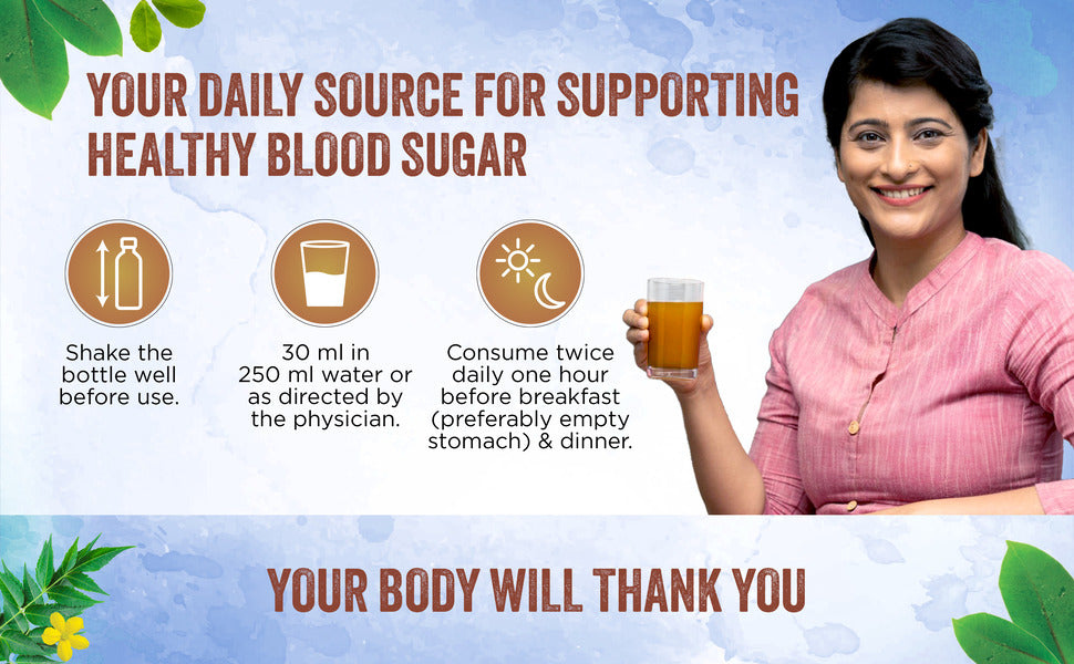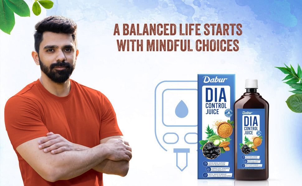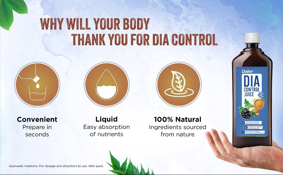 Manufactured By:-Dabur Dia Control Juice is a blend of 13 potent herbs like Jamun, Karvellaka, Methi, Asan, Meshashringi & Triphala. As per published data these herbs are useful in maintaining blood sugar levels. These powerful herbs help in maintaining blood glucose levels thereby assist you in leading a healthy life. This product is crafted with premium natural ingredients and undergoes strict quality control to ensure the best quality. It is free from added sugars, artificial colours, sweeteners and is perfect for daily consumption. The herbs are expertly blended using a water-based method to preserve their phytoconstituents.