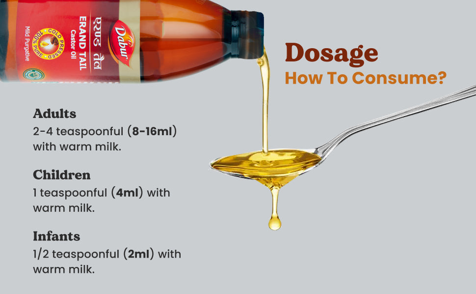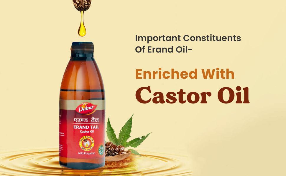 Manufactured By:-Dabur Erand/Castor Tail is a multi-purpose oil that can be used to help provide relief from constipation and regulate bowel movements. It is also used for skin and hair care purposes and helps get healthy hair and acne-free skin.