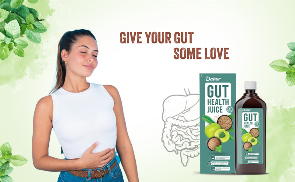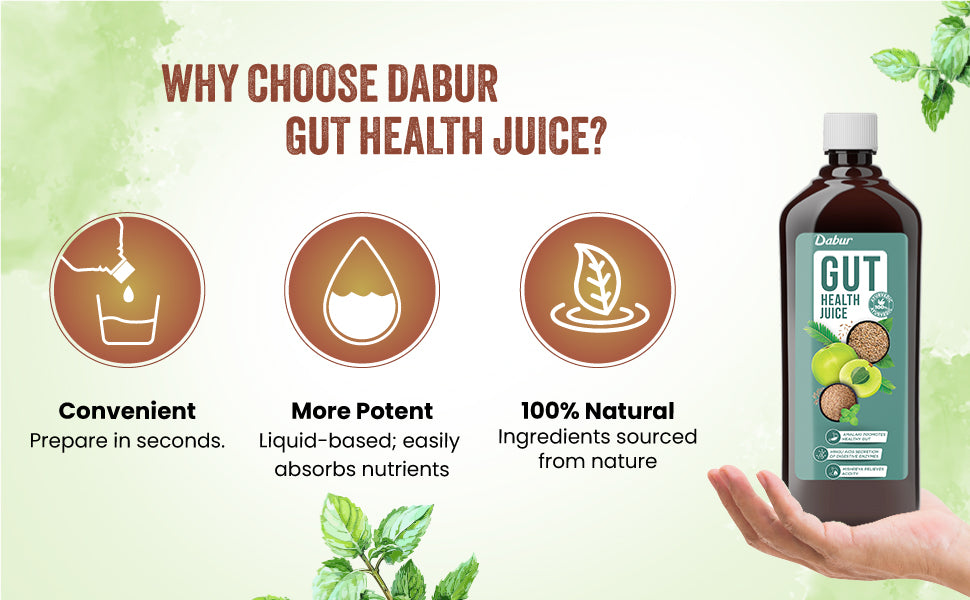 Manufactured By:-Our juice is designed to help you, feel you best. Dabur Gut health juice contains combination of 12 powerful Ayurvedic ingredients like Amla, Sunthi, Saunf, Ajwain- all are selected to boost digestive health. Amla is a potent antioxident and has been used for centuries to promote good gut health. Sunthi, Saunf & Ajwain helps in secretion of digestive enzymes & help reduce indigestion and blotting. The Juice is created by blending a carefully selection of herbs at optimal ratio using a water based concentration process. The procedure helps preserves the Phyto constituents content of the Juice. This juice is free from harmful pesticides, additives and suitable for daily consumption. If you want to change your life, try Dabur- Gut health juice. From a single bottle comes a big change for better digestive and healthy life.