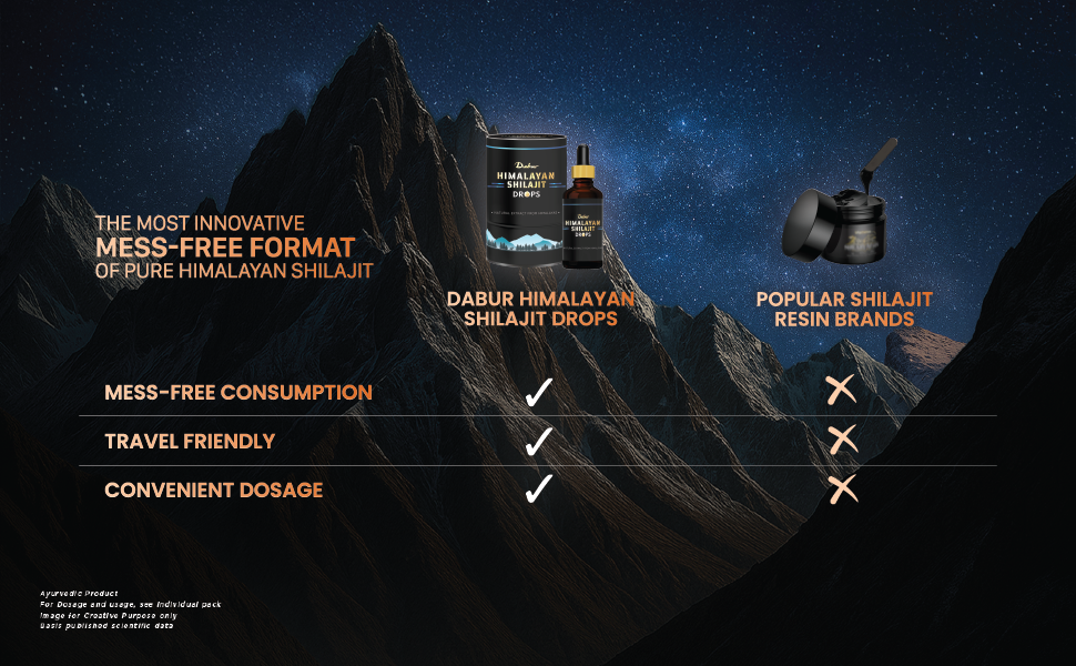 Manufactured By:-Unleash your Potential now with Mess-free & convenient dosage of Dabur Himalayan Shilajit Drops. Try at great value of Rs 4 per dose only vs Rs 12 of popular Resin brands