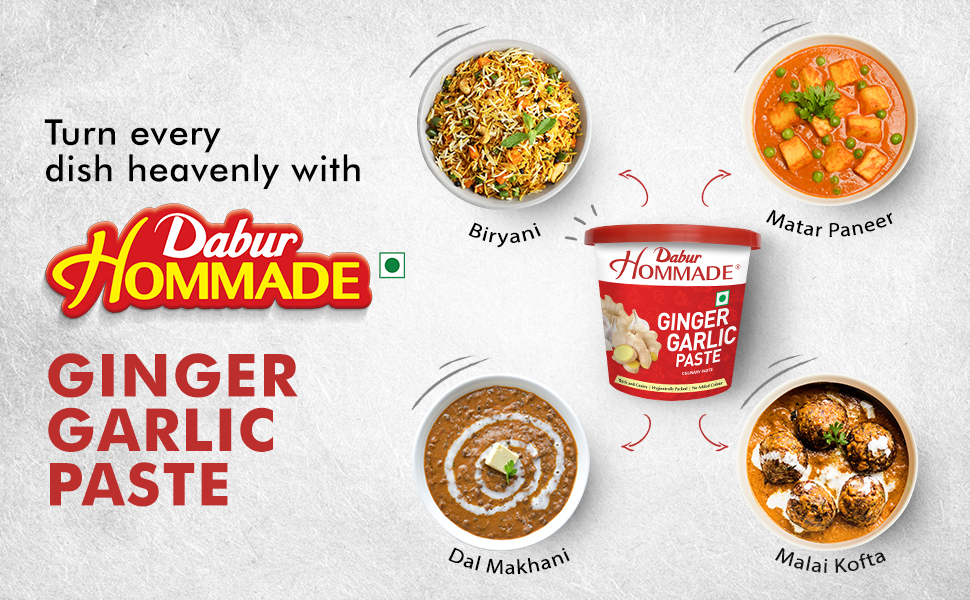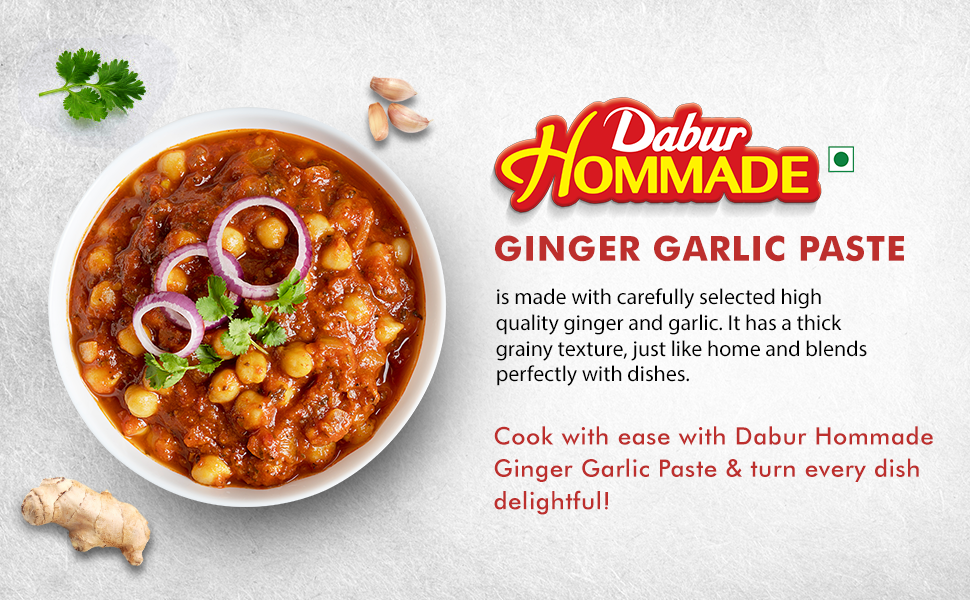 Manufactured By:-Dabur Hommade Ginger Garlic Paste is prepared from carefully selected best quality ginger and garlic. It has a strong distinctive aroma of freshly ground ginger and garlic and blends perfectly with dishes to enhance the taste. It is thick and grainy with no added colour.