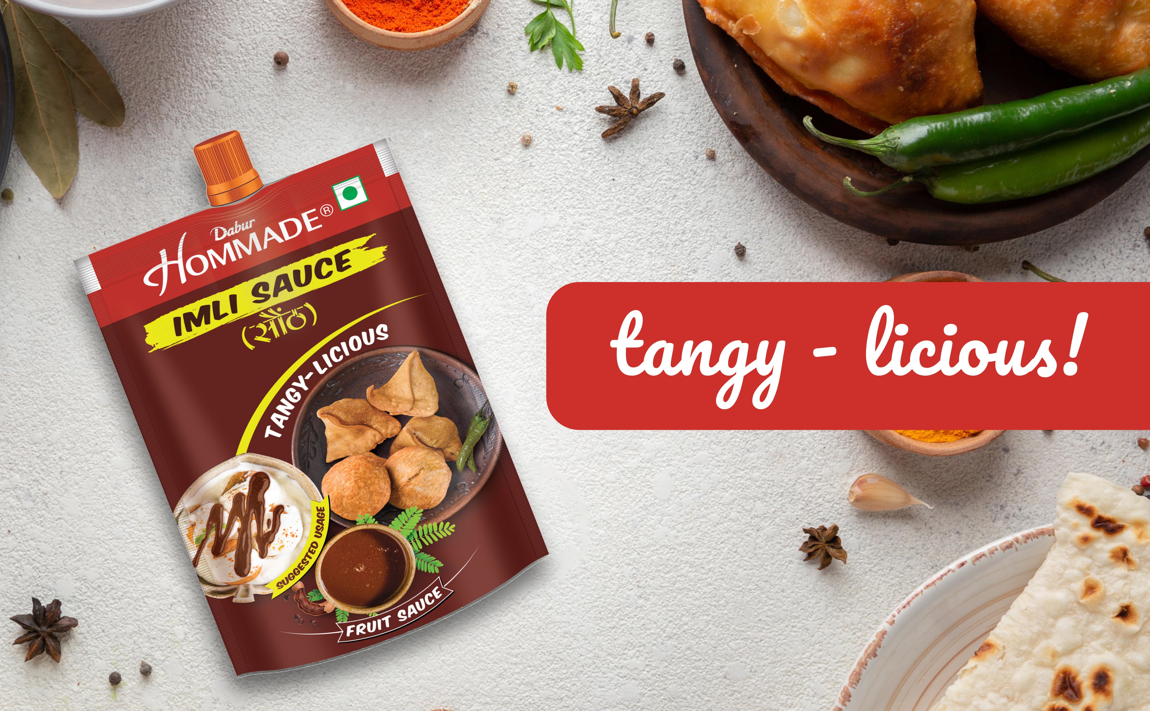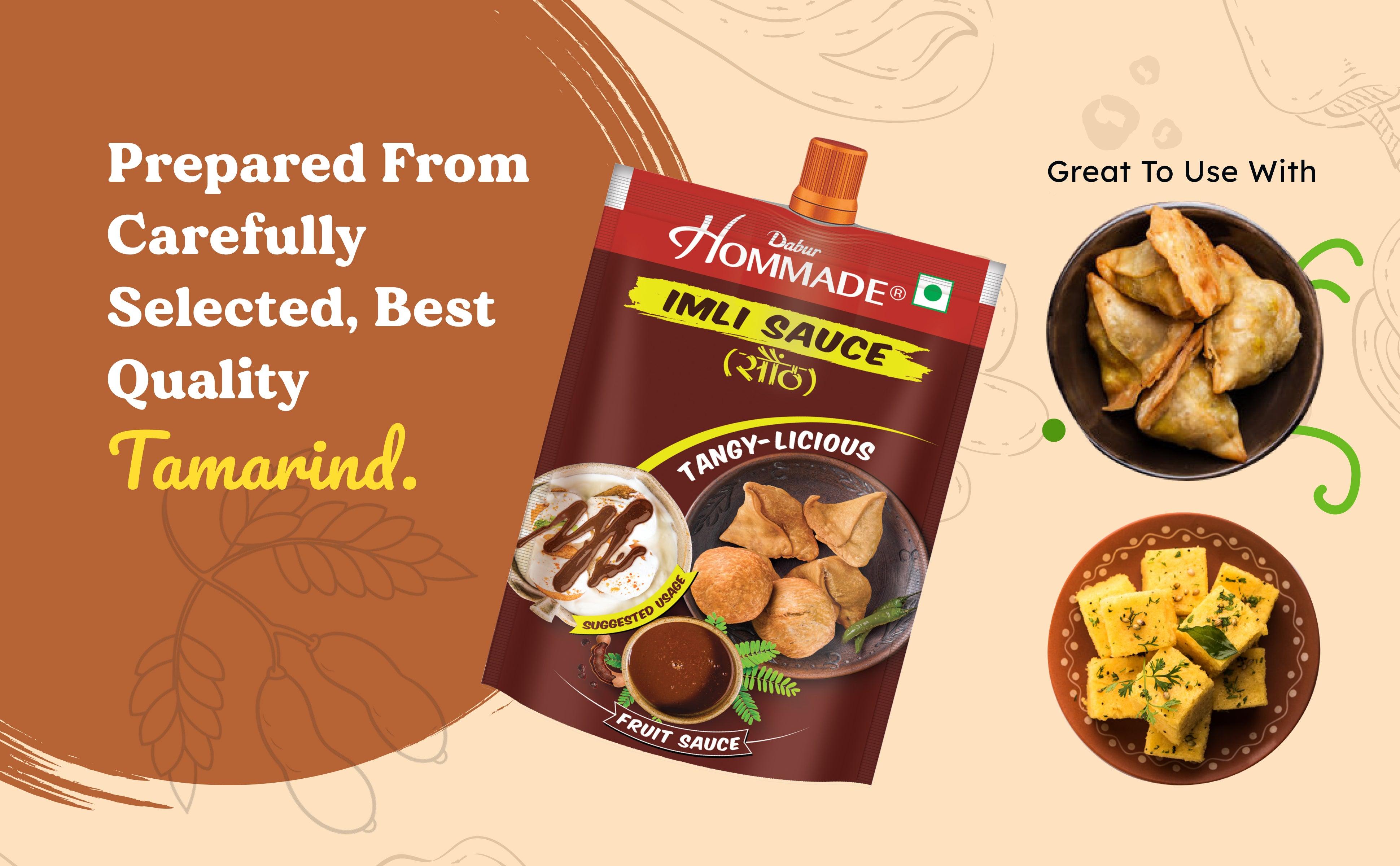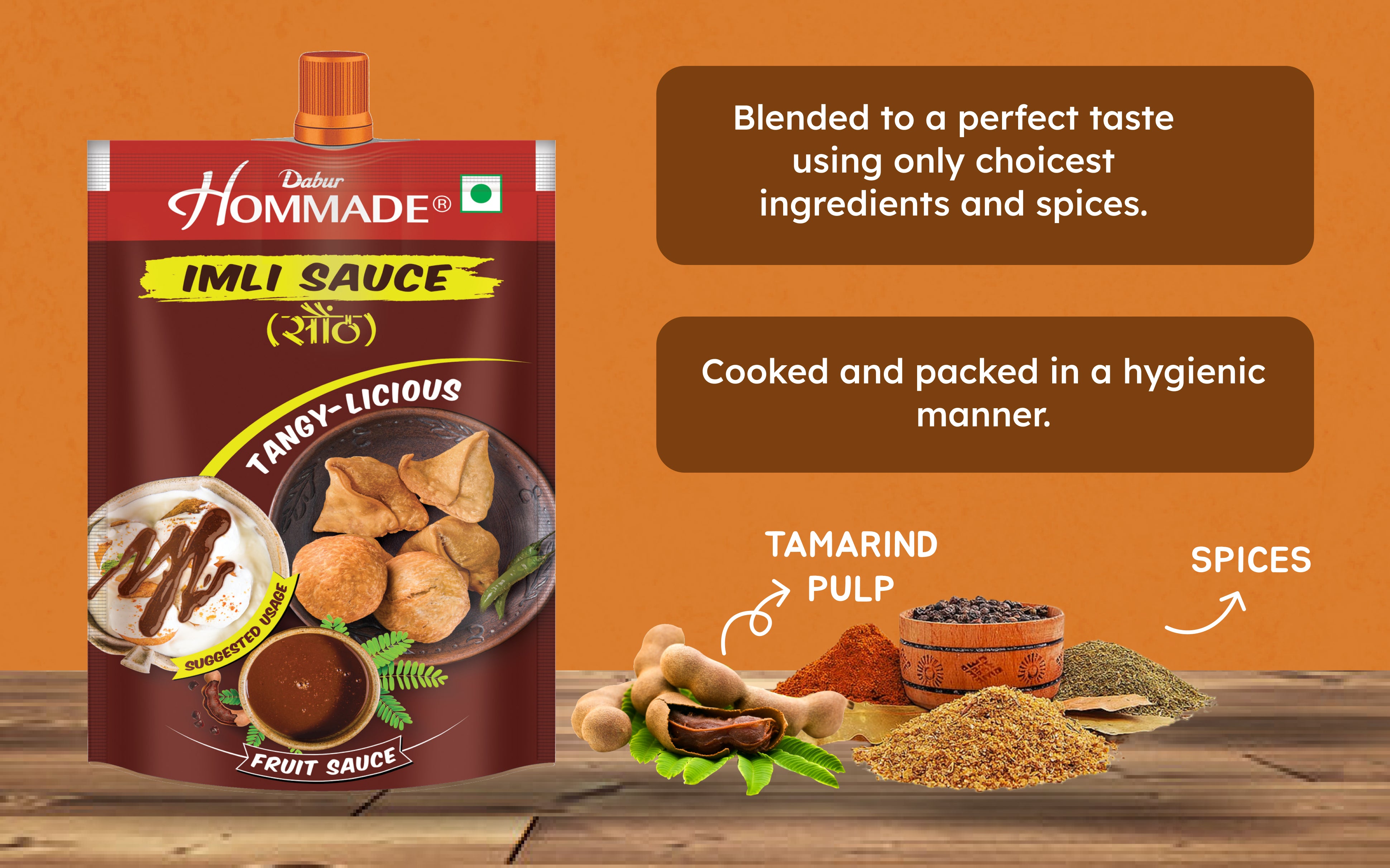 Manufactured By:-Dabur Hommade Imli Sauce is a perfect blend of tangy and sweet tamarind taste with a hint of spicy flavour. It is ready to eat Imli Sauce, popularly known as Saunth. Serves as perfect combination to all your chaat and snack items.