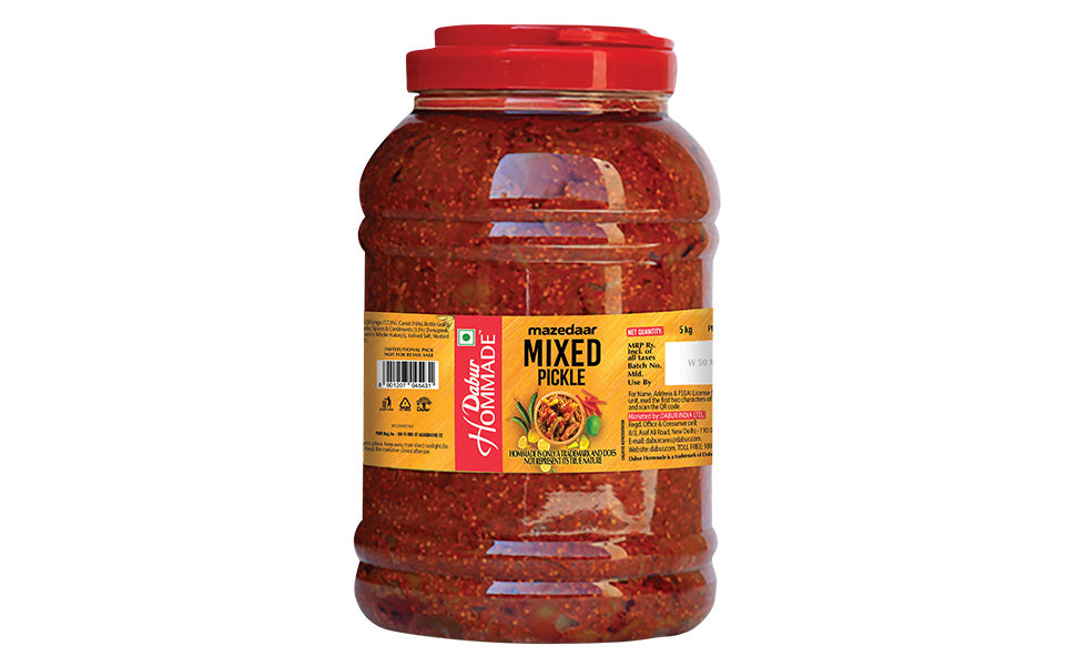 Manufactured By:-Dabur Hommade Mixed Vegetable Pickle has the perfect mix of Mango, Carrot, Lemon and Chili with a blend of zesty spices which is the perfect accompaniment to everyday meals. Mixed Pickle can be an accompaniment to lunch, breakfast or dinner routines to add a zingy & zesty flavourful punch to your meals.