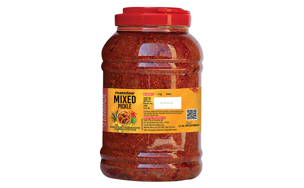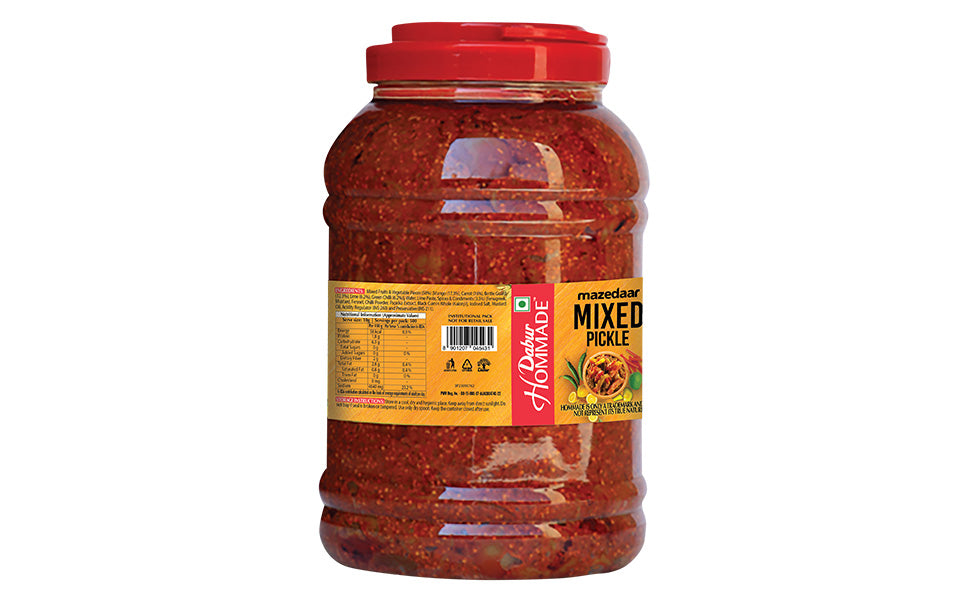Dabur Hommade Mixed Vegetable Pickle has the perfect mix of Mango, Carrot, Lemon and Chili with a blend of zesty spices which is the perfect accompaniment to everyday meals. Mixed Pickle can be an accompaniment to lunch, breakfast or dinner routines to add a zingy & zesty flavourful punch to your meals.