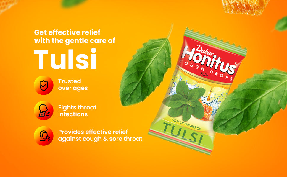 Dabur Honitus Cough Drops are packed with the power of honey and essential Ayurvedic herbs. Available in honey ginger, honey tulsi, honey lemon, and honey orange flavors.