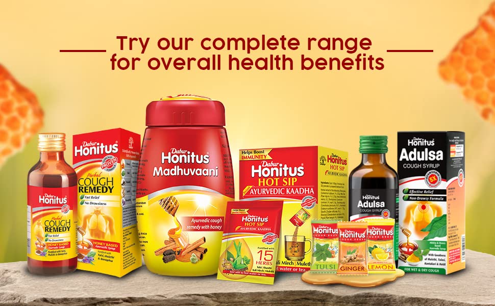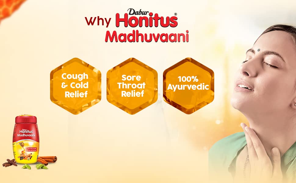 Manufactured By:-Dabur Honitus Madhuvaani is a pure herbal formulation which is made using traditional herbs and natural ingredients. It is a blend of age-old traditional ayurvedic ingredients for cough and cold which combines sitopaladi churna with honey as recommended by Ayurved. It is a premixed mixture that provides effective relief from sore throat, cough and cold. It is a good anti-allergic, and expectorant and helps relieve congestion.