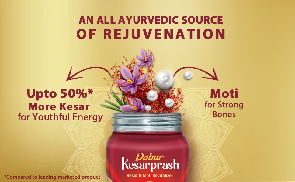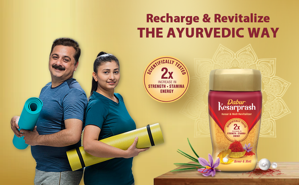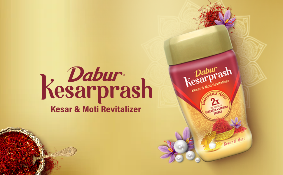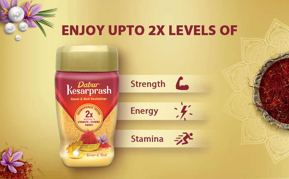 Dabur Kesarprash is an Ayurvedic revitalizer with Kesar & Moti. Kesar is for youthful energy and Moti for strong bones. It is scientifically tested to give 2X increase in strength, stamina & energy.