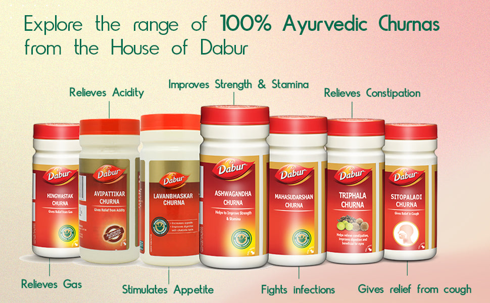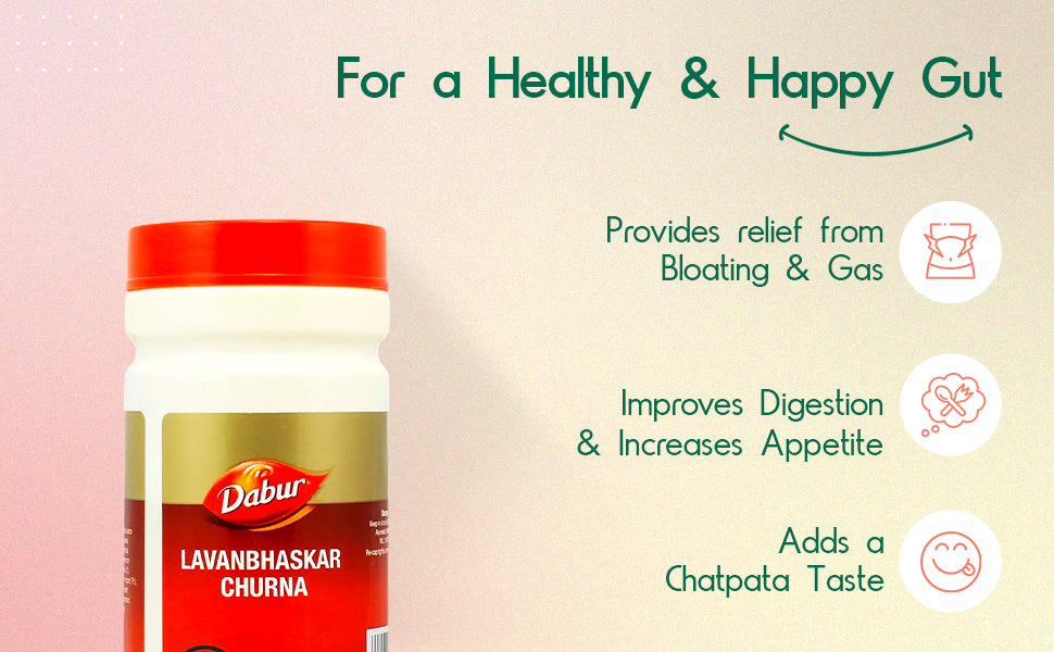 Dabur Lavanbhaskar Churna is an Ayurvedic formulation made with selected salts that can help reduce indigestion and acidity. It has a tangy taste that helps improve appetite in cases of loss of taste. It is also beneficial for constipation and irregular bowel movements.