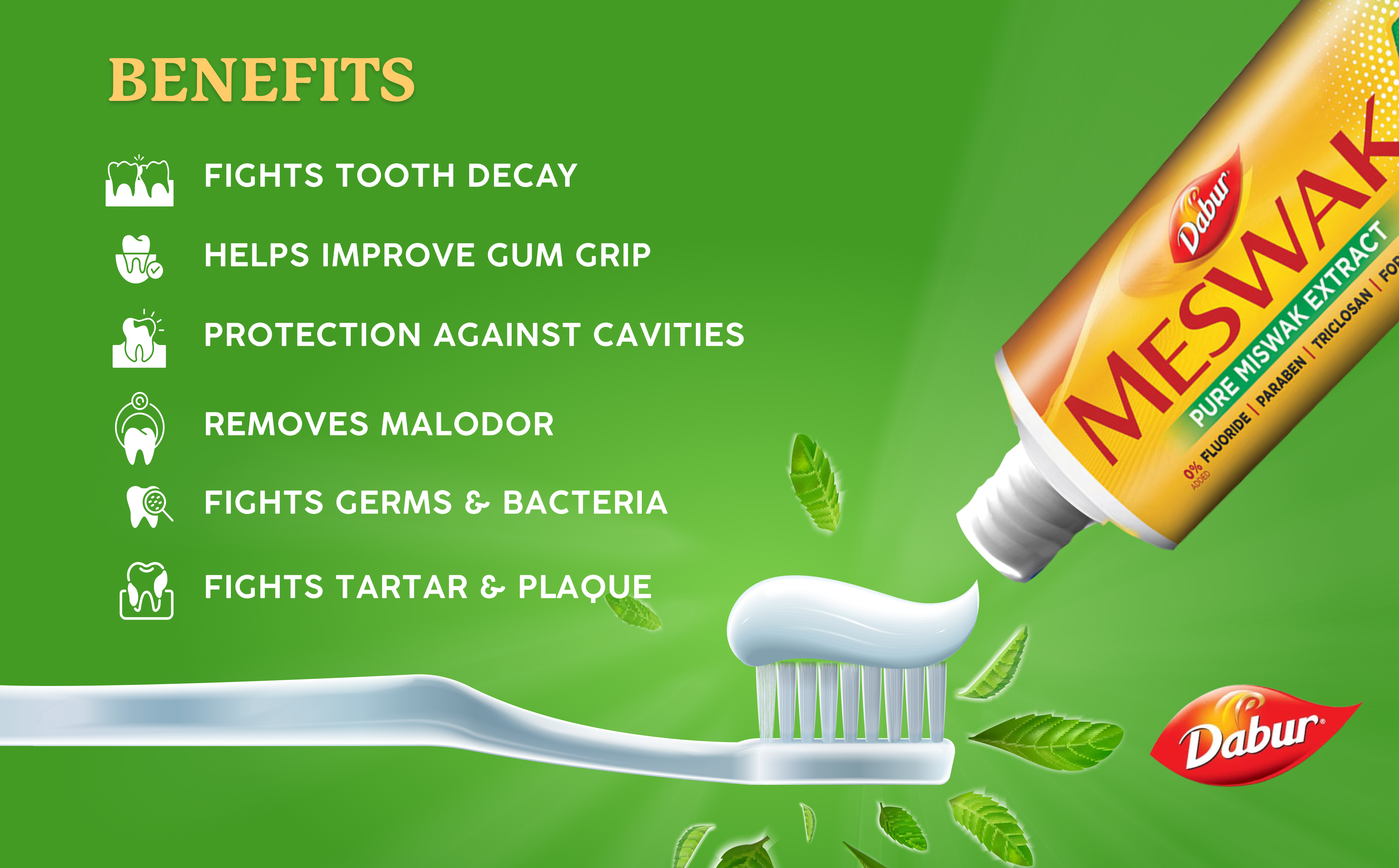 Dabur Meswak is made from pure extract of rare Miswak herb which grows slowly, resisting the brutal forces of nature amidst the sand dunes of Africa and South Asia. Even a small portion of this herb is capable of providing Complete Oral Care to you. It is known for providing oral care to humanity since ages. It has Resins which form a layer over the enamel - protecting against caries; Silica which removes stains; Alkaloids exerts a bactericidal effect and stimulatory action on gingival; Essential oils stimulates the flow of saliva which works as an antiseptic & Vitamin C helps in healing and repair of tissues. The best part of this unique toothpaste is the amazing mouthfeel it leaves behind, which lasts the whole day.