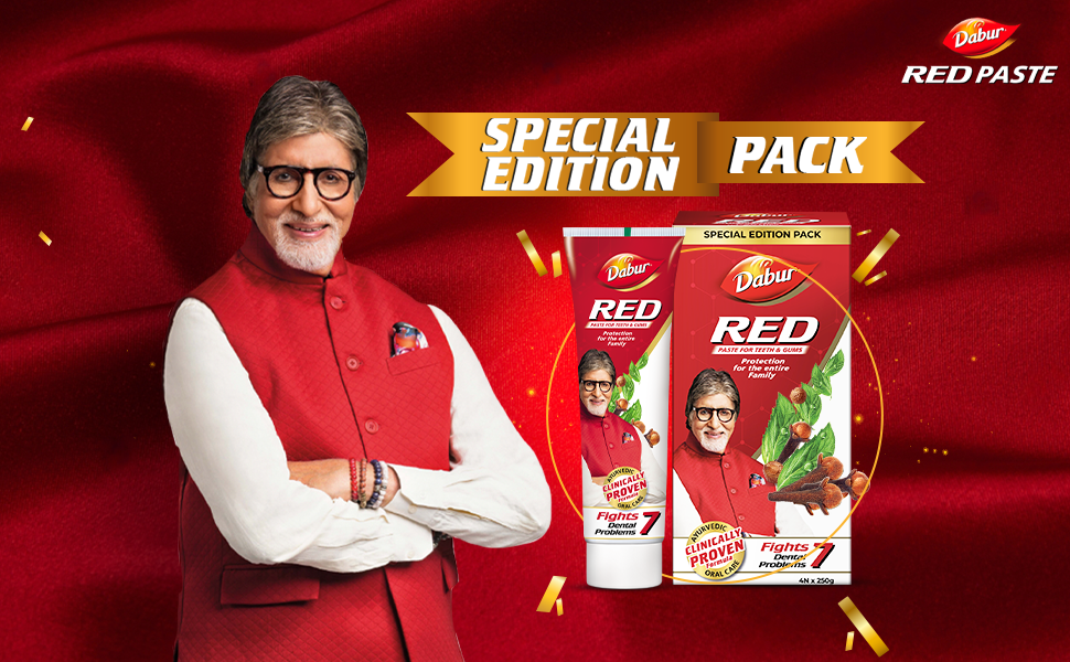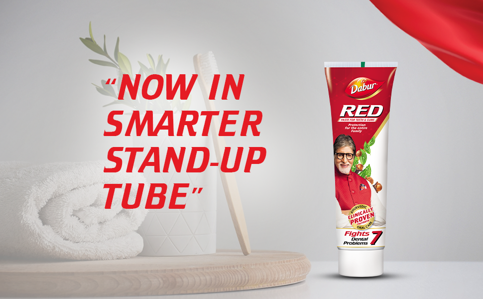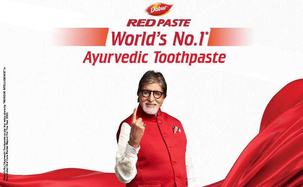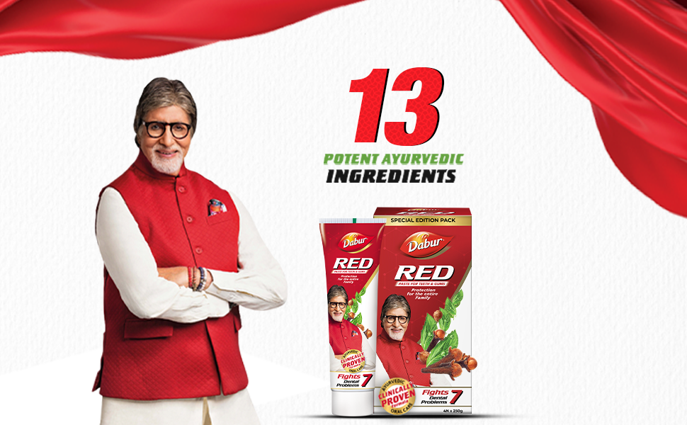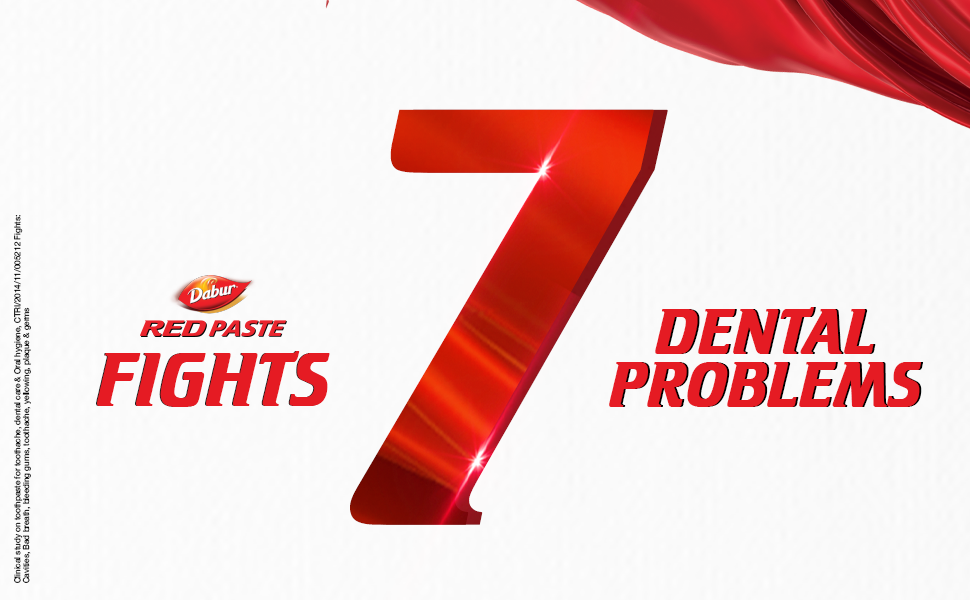 DABUR RED PASTE has a clinically proven formula that fights against 7 DENTAL PROBLEMS: 1) Toothache, 2)Cavities, 3) Plaque, 4) Germs, 5) Bad Breath, 6) Yellowing, and 7) Bleeding Gums. It is fluoride free and made with 13 potent ayurvedic ingredients including Pudina Satva that provides fresh breath, Laung ka Tail that relieves toothache, Shunthi that has anti-inflammatory and antibacterial properties, and Tomar Beej that has antiseptic and antibacterial properties. It is clinically shown to provide a remarkable 35% improvement in oral care hygiene compared to regular toothpaste and provides complete protection for the entire family.