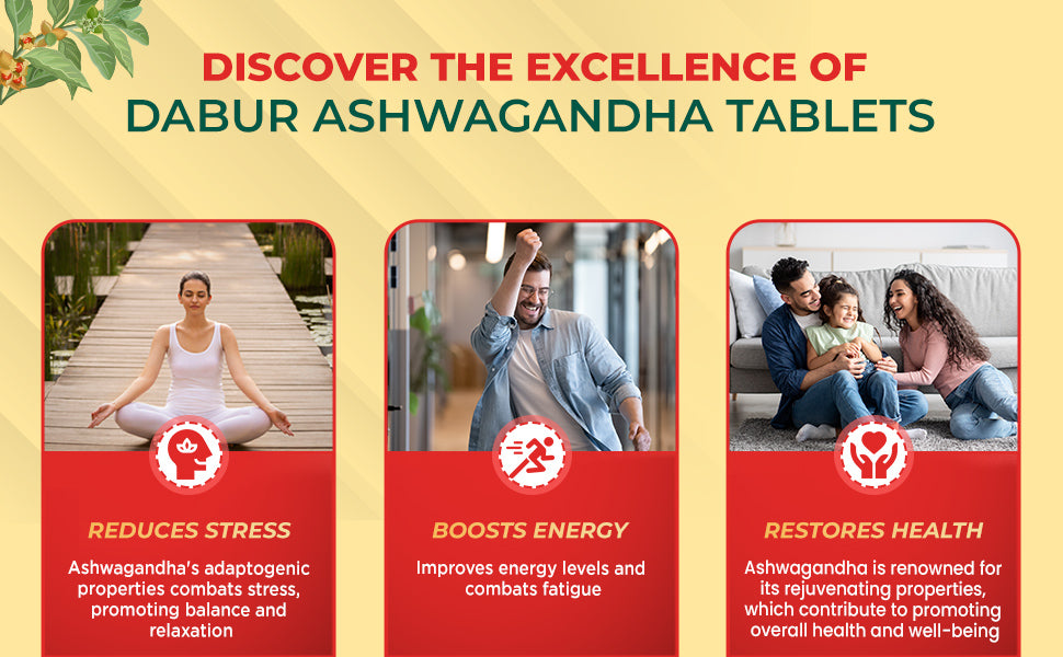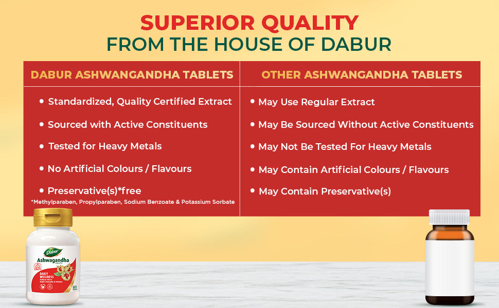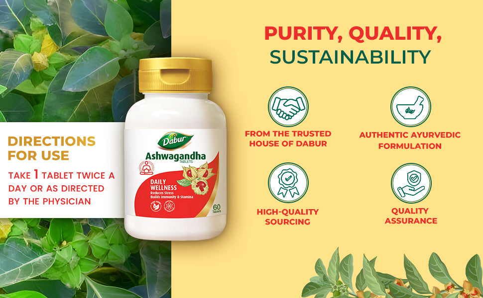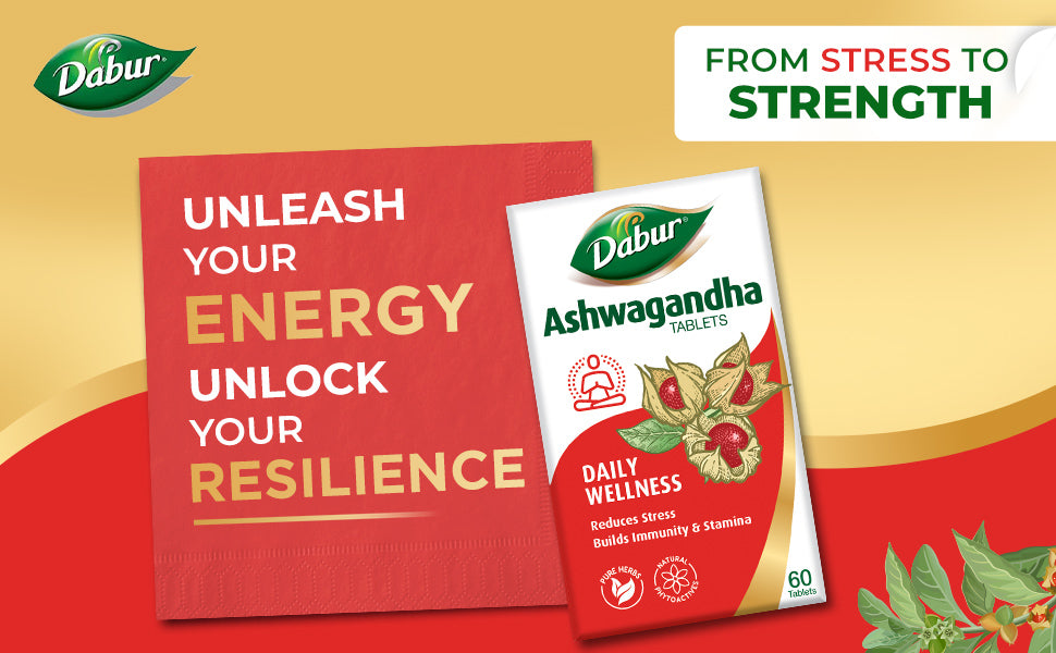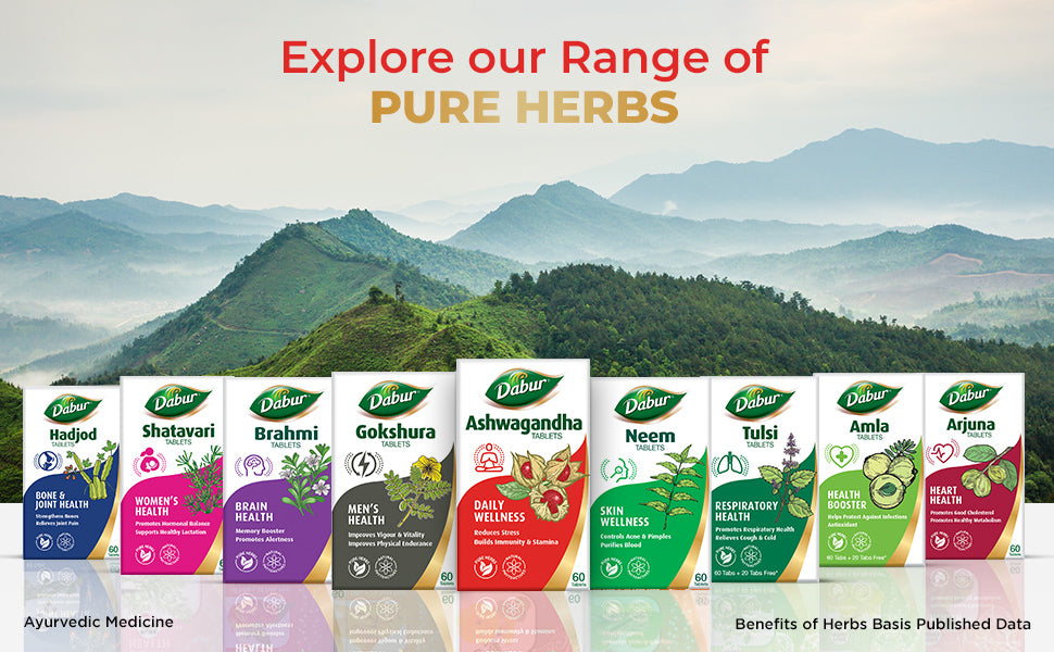 With over 130 years of expertise in Ayurveda, Dabur has always been committed to the health and well-being of every household. Power packed with the age-old wisdom of Ayurveda, Dabur Pure Herbs range of tablets is the latest offering from the house of Dabur in fulfilling this vision. The immunity boosting Dabur Ashwagandha Tablets in our range have the goodness of Ashwagandha in it. Ashwagandha is an immunomodulator that helps boost the immunity and also exhibits strong anti-oxidant activity, which helps to decrease oxidative stress. Ashwagandha exhibits neuroprotective action that helps to strengthens the neurons (functional unit of the brain) which can help to improve cognitive functions like learning, concentration, memory etc. Ashwagandha also helps with general weakness and in relieving stress levels, thereby making it a perfect choice for your overall health.
