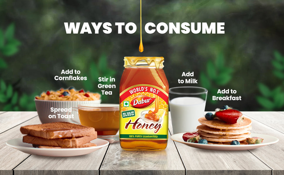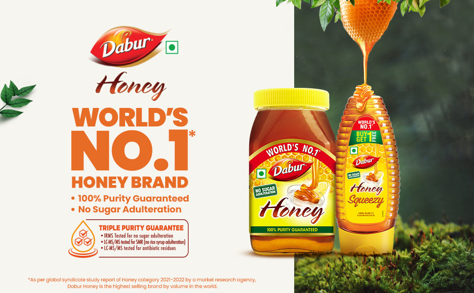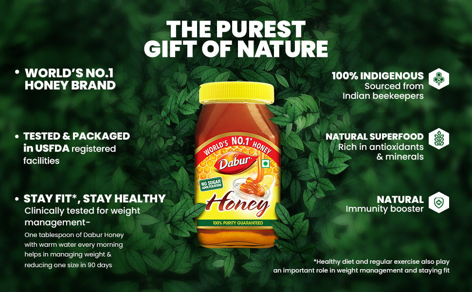 Do you want to boost your Immunity? Do you find it difficult to manage your weight? Do you want to give a healthy start to your day? If the answer to the above questions asked is YES, then you should definitely include Dabur Honey as a part of your daily regime. Dabur Honey is entirely sourced from Indian beekeepers and conforms strictly with all the 22 parameters mandated by FSSAI (Food Safety and Standards Authority of India) for testing Honey. In addition, Dabur Honey is also LCMS - MS tested for zero presence of antibiotics, as further mandated by FSSAI. It is also IRMS tested for zero added sugar and SMR tested for zero presence of rice syrup. According to a recent clinical study, people who consume Dabur honey with warm water every morning, showed significant improvement in stamina, digestion, cholesterol level & waist/hip size, hence maintaining a healthy lifestyle.