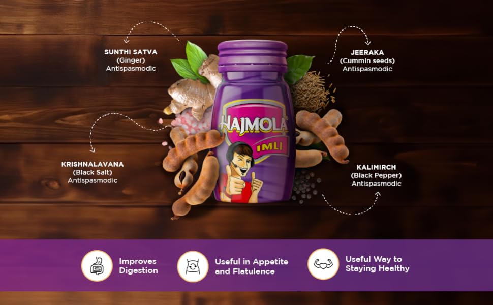 Manufactured By:-Dabur Hajmola lets you enjoy the chatpata taste as it stimulates your digestive power, especially when taken regularly after meals. Dabur Hajmola is a mix of traditional Indian culinary herbs, spices and edible salts. Not only does it get your digestive juices working better, it is also a useful laxative for children. Hajmola's khatta-meetha taste is available in regular, imli and anardana flavours.