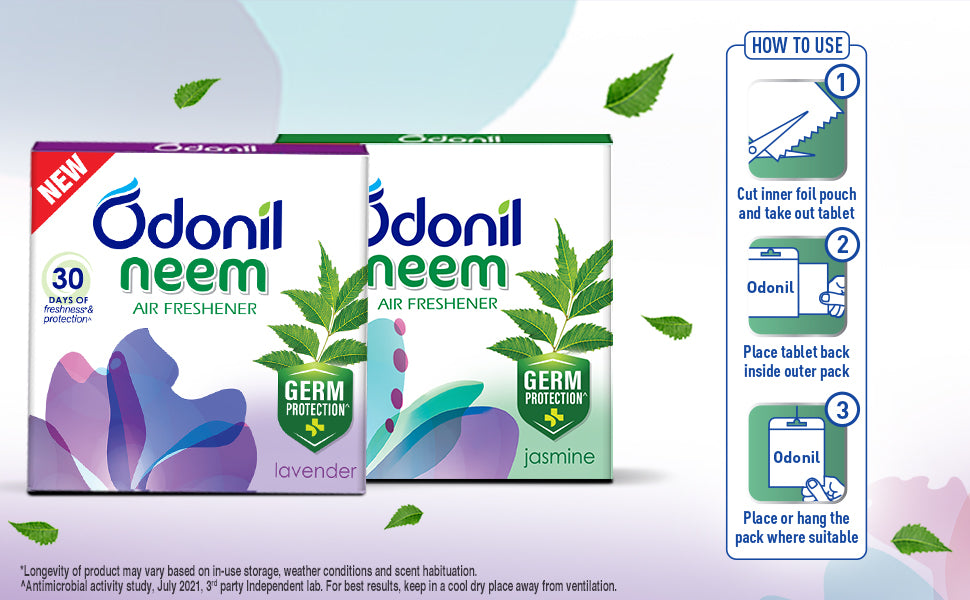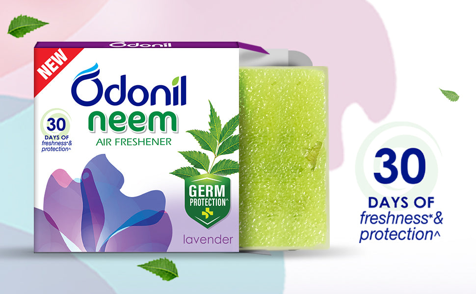 Odonil Neem Blocks, infused with Neem leaves to give you protection and fragrant bathrooms for upto 30 days. - Comes with Odor Buster Technology that removes malodor. - Infused with Neem leaves, known for Germ Protection. - Available in 2 Fragrances - Lavender and Jasmine.