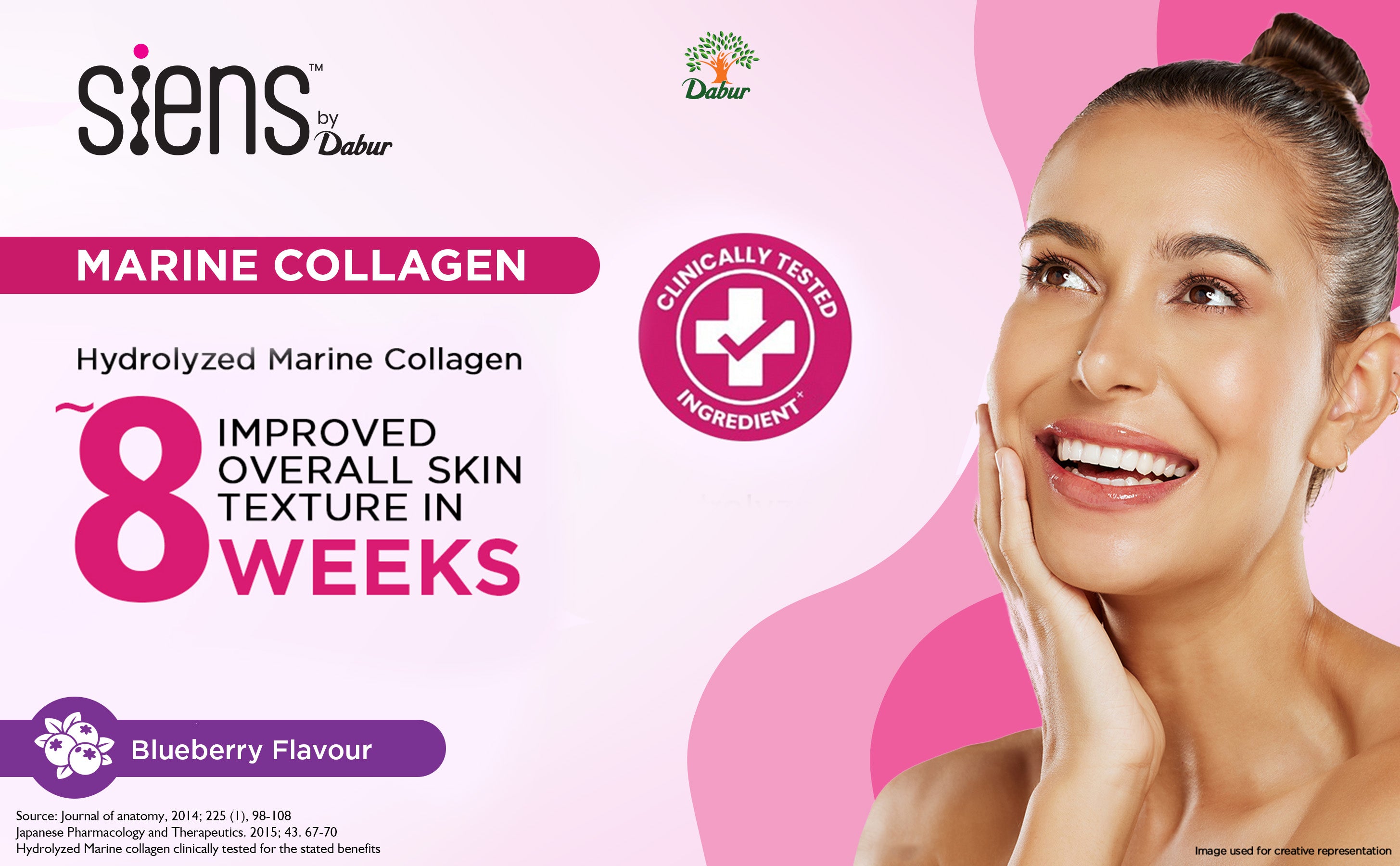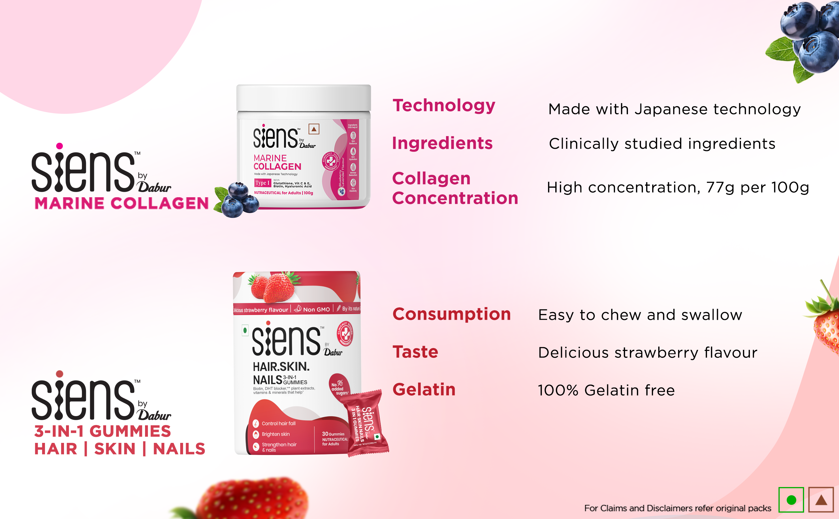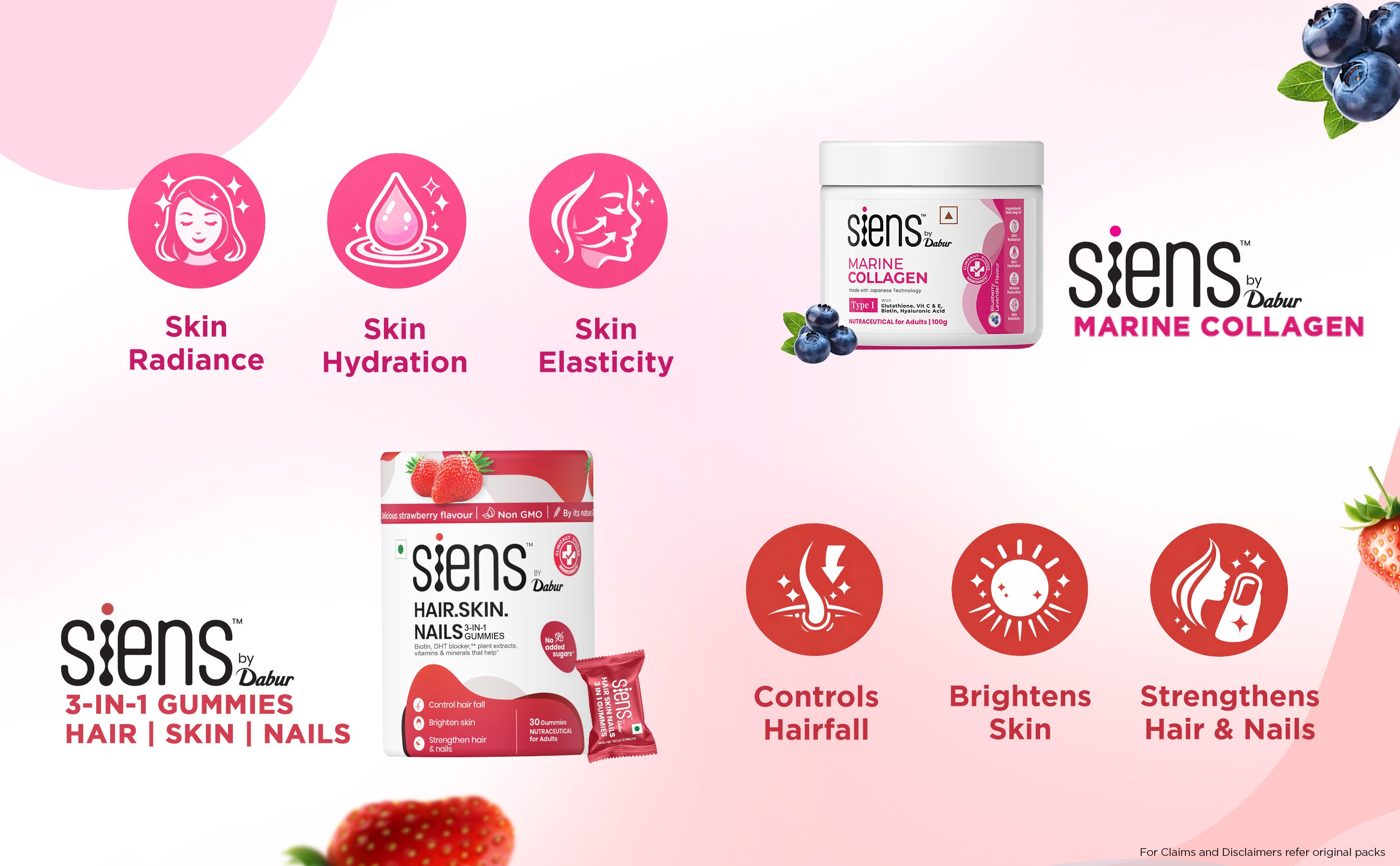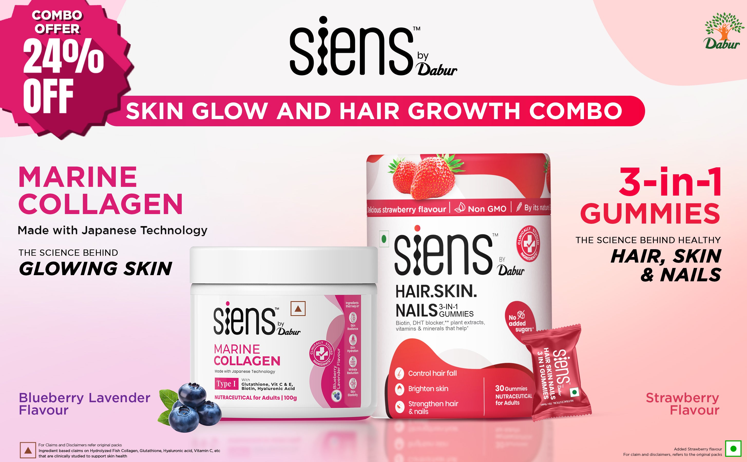 Manufactured By:-Achieve complete beauty nourishment from within with the Siens by Dabur Ageless Beauty Combo, a powerful inside-out solution combining Hydrolyzed Marine Collagen and Hair, Skin & Nails Biotin Gummies. Designed to work synergistically, this duo supports skin elasticity, hair strength, nail health, and overall radiance—addressing both structural repair and daily micronutrient support.